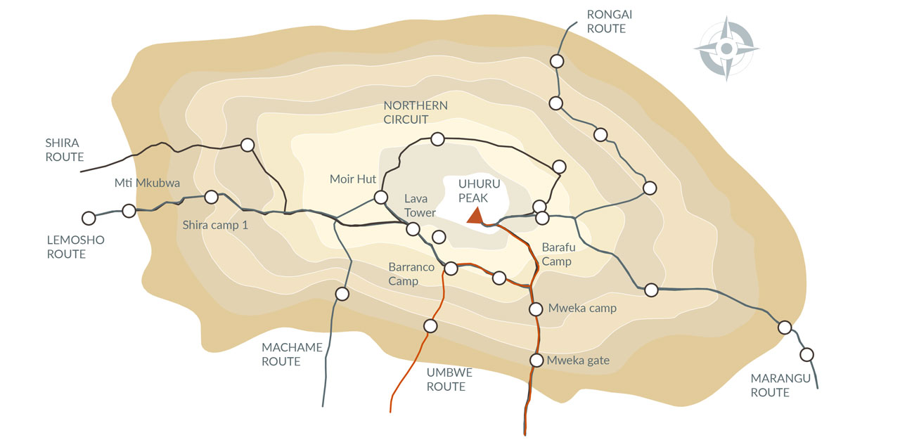 The Umbwe route is the most physically taxing and least used up Mount Kilimanjaro. On the first two days you will have a steep uphill climb almost the whole way and breathtaking views off the ridges, all without the clutter of other climbers – sweet reward for the physical demands on your legs that the route makes. You eventually join trails with those coming from the Machame route and Lemosho route, and carry on up the Great Barranco Wall to Karanga Valley and Barafu Camp before your summit push to Uhuru Peak in the wee hours of the morning of your 5th day on the mountain.